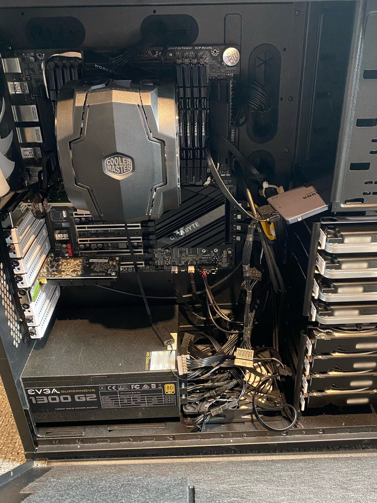 The next big leap was creating a custom PC build for the first time with the help of my brother-in-law. He showed me all the parts I needed and how to buy used parts without getting ripped off. This solidified my love for computer tinkering and problem-solving. I built this system as a Hackintosh PC. The CPU was an i7-3770K and used a Gigabyte motherboard. The best part was that I deshelled multiple of my matching external HDDs and created an eight-drive RAID 10 configuration with a RocketRAID card. I experienced two different 2 bad motherboards during the course of using this machine. This was quite the learning experience and tested my backup habits. I started with a GeForce GTX 660TI. Later, my brother-in-law gave me a GTX 980 as a gift, and the additional CUDA cores and VRAM made my editing software faster and much more stable. I also began Linux distro hopping for the first time with this machine, starting with Linux Mint and Ubuntu.